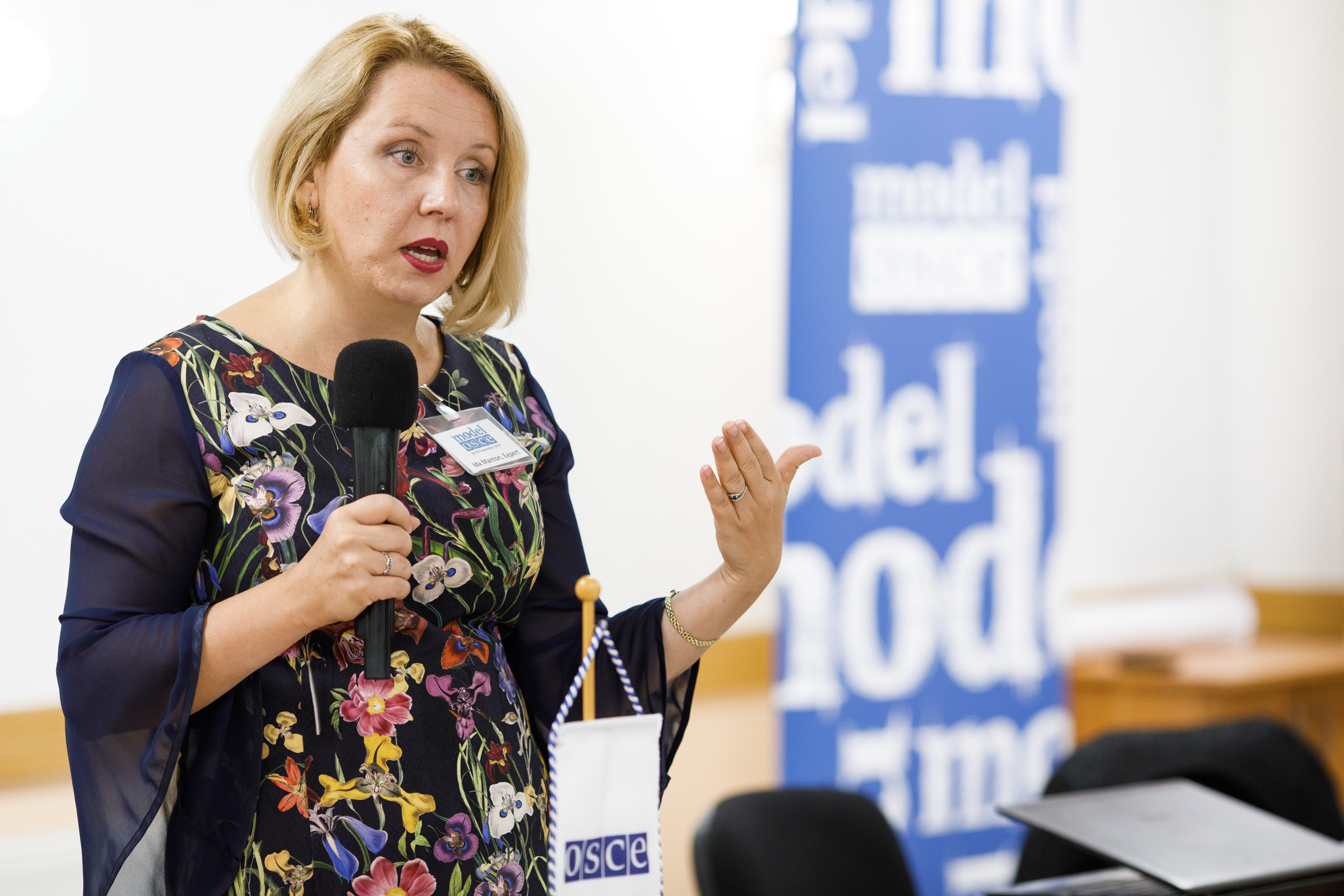 The international expert Ida Manton talks to participants of the Model OSCE for Youth about negotiation, mediation and dialogue facilitation in the OSCE, Vadul-lui-Voda, Moldova, 26 September 2019.