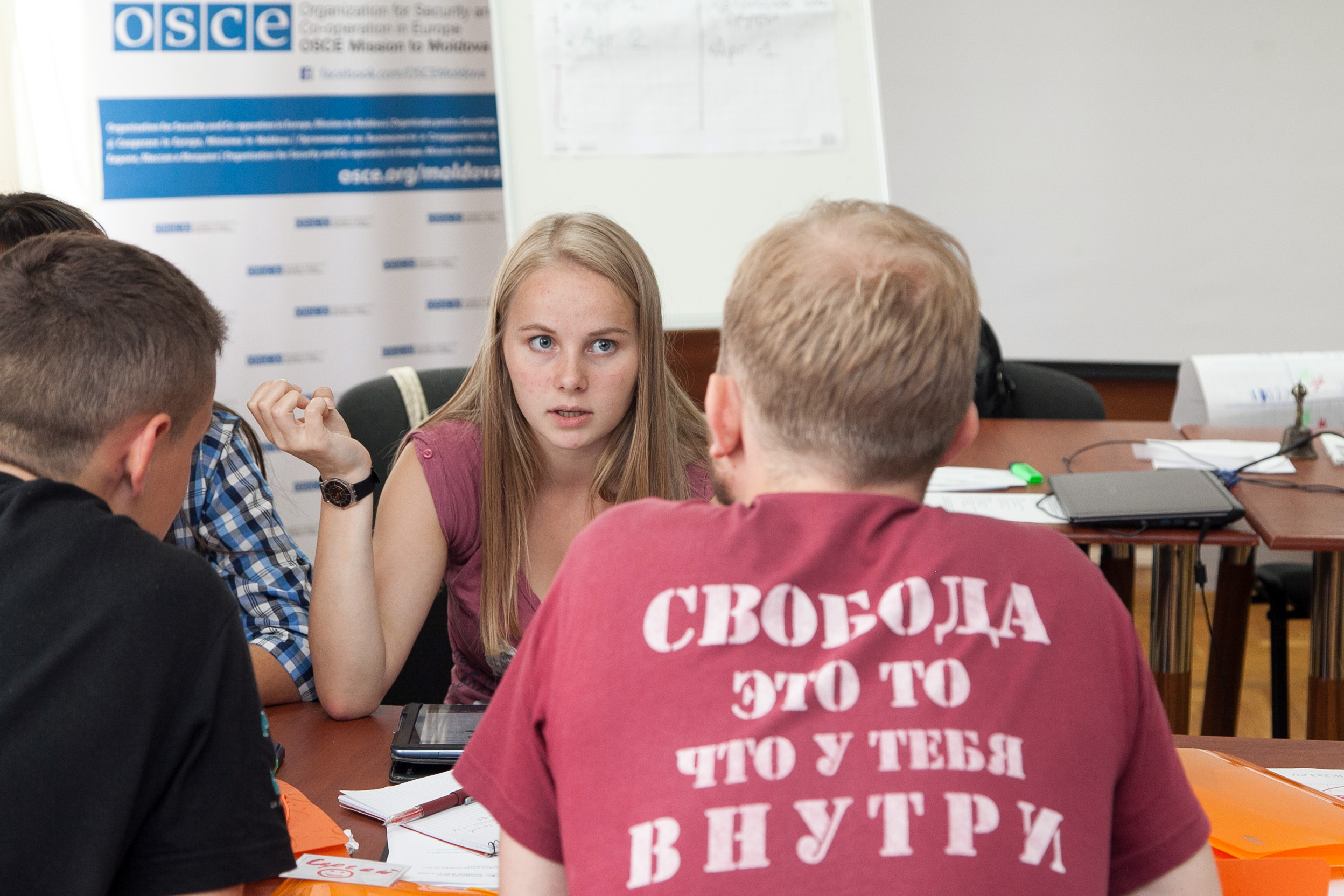 Students discuss debate techniques in preparation for debates to be held this autumn with the help of the OSCE Mission to Moldova, Vadul-lui-Vodă, 28 June 2015.