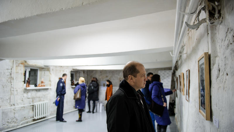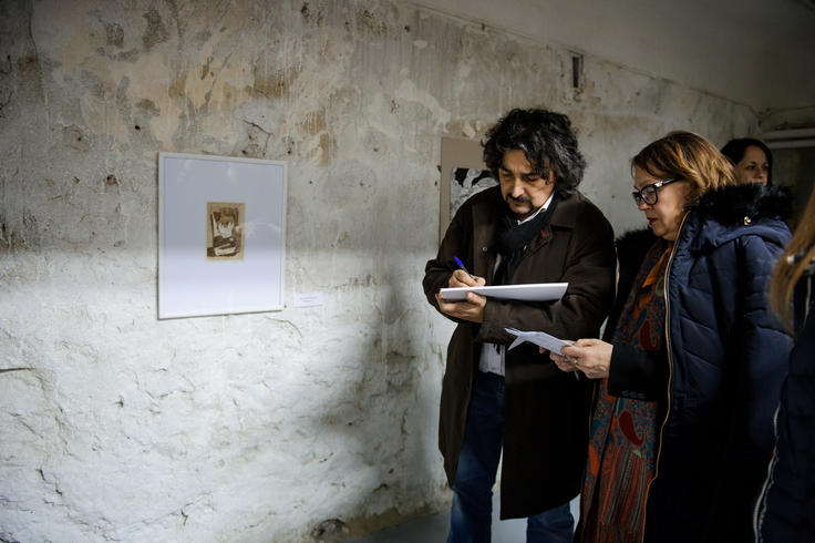 Members of the art competition selection committee, Valentina Bodrug-Lungu and Vasile Sitari, evaluate artworks submitted as part of the competition, Chisinau, 27 November 2015.