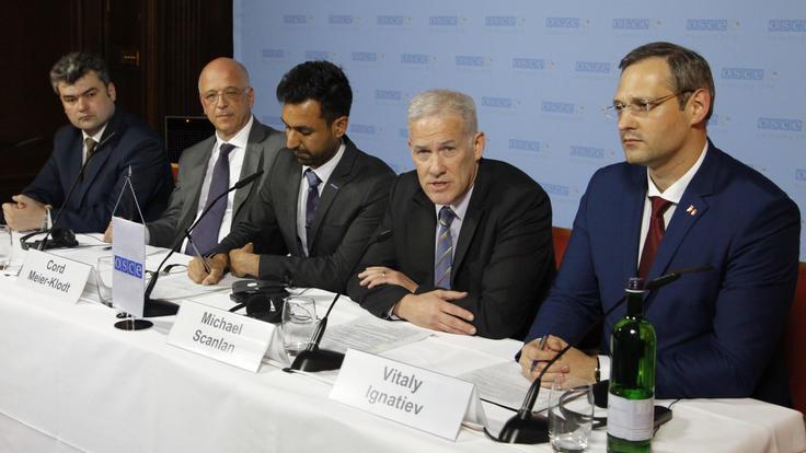 L-r: Gheorghe Balan, Political Representative for Moldova; Cord Meier-Klodt, Special Representative of the OSCE Chairperson-in-Office; Shiv Sharma, Acting Deputy Spokesperson of the OSCE; Michael Scanlan, Head of the OSCE Mission to Moldova; and Vitaly Ignatiev, Political Representative for Transdniestria, at a press conference following formal 5+2 talks, Berlin, 3 June 2016.