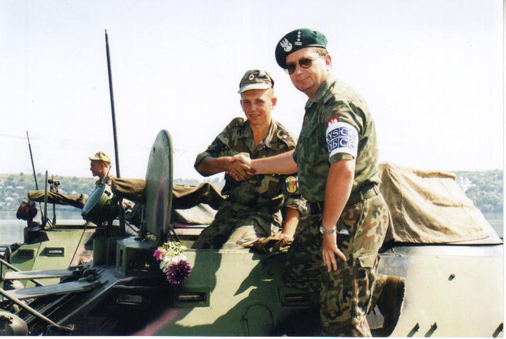Col. Jan Nadolski, military mission member of the OSCE Mission to Moldova, congratulates a young Moldovan conscript on the withdrawal from the security zone as they prepare to cross the river Dniestr, 14 August 2003.