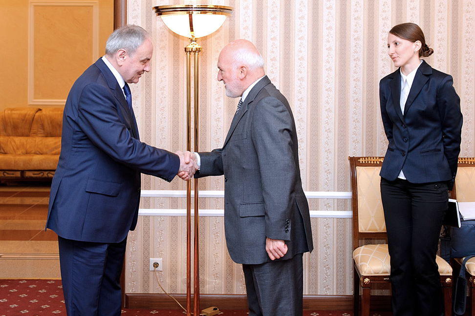 Ambassador Erwan Fouéré (m), the Special Representative of the Chairperson-in-Office for the Trandniestrian conflict settlement process, meets Moldovan President Nicolae Timofti (l), Chisinau, 5 April 2012.