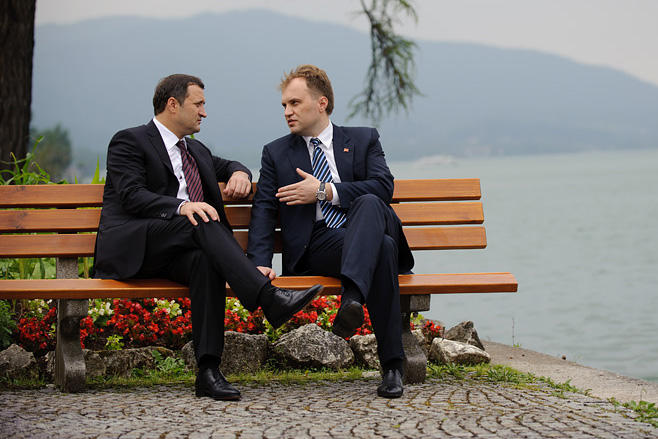 Moldovan Prime Minister Vladimir Filat (l) and Transdniestrian leader Yevgeny Shevchuk speaking on the margins of an OSCE conference in the German town of Rottach-Egern, 20 June 2012.