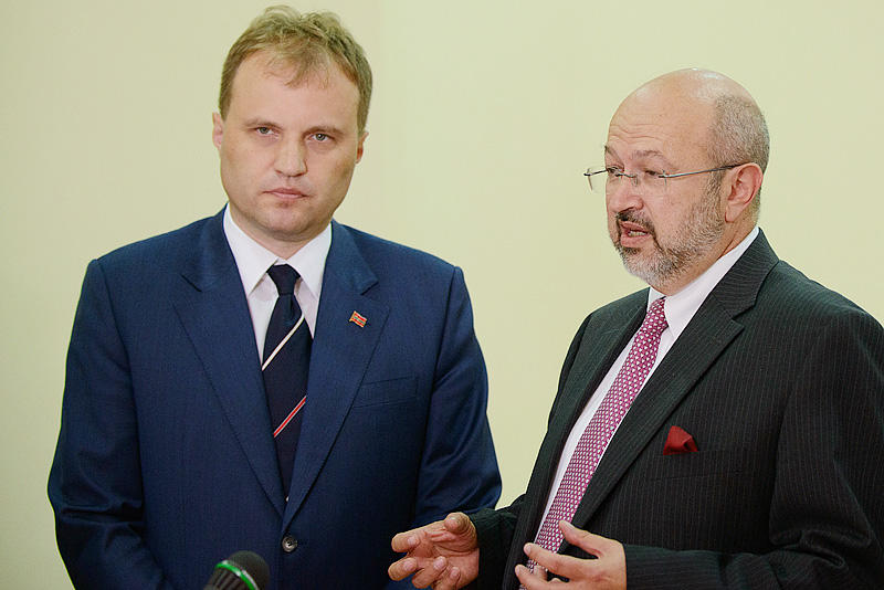 OSCE Secretary General Lamberto Zannier (r) and Transdniestrian leader Evgeny Shevchuk following their meeting in Tiraspol on 18 July 2012.