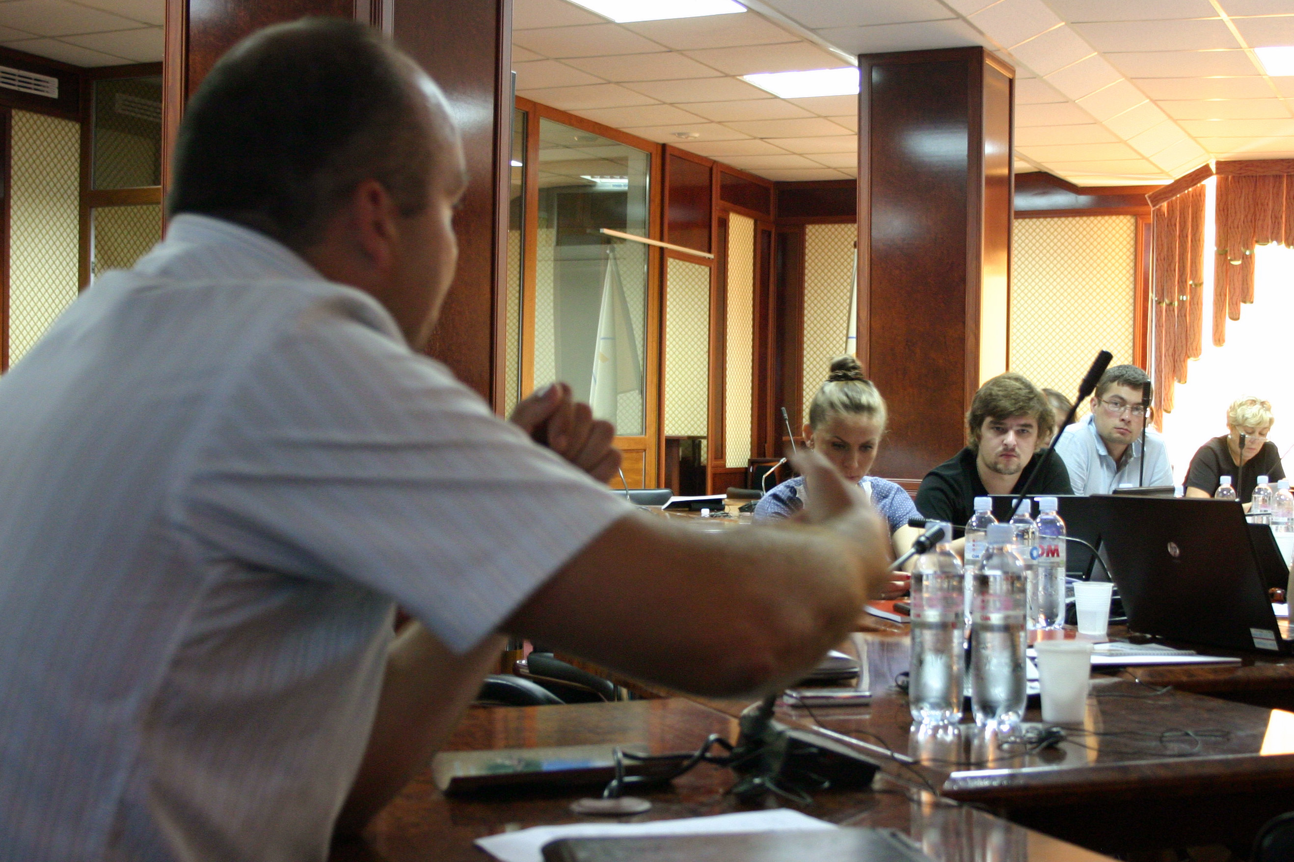 IDIS expert Corneliu Ciurea (l) addressing participants of an OSCE summer school for journalists on the public financing of political parties and the role of media in raising transparency in political funding, Vadul Lui Voda, 7 September 2012.