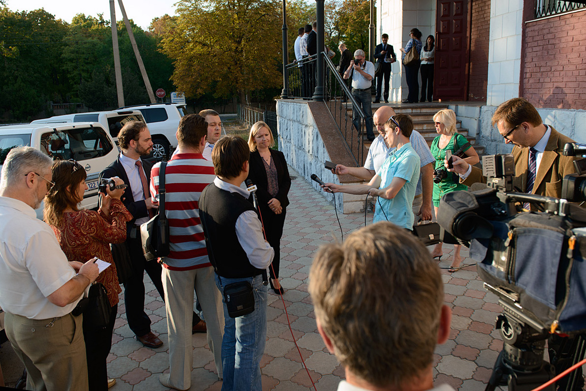 Lucinda Creighton, Irish Minister for European Affairs and the Representative of the Irish Chair-in-Office of the OSCE, addresses journalists outside the OSCE Office in Tiraspol. She emphasized the need to maintain momentum in the negotiations on a political settlement of the Transdniestrian conflict, 20 September 2012.