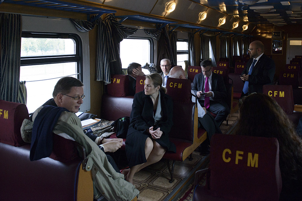 Representatives of the OSCE, the European Union, the United States and Ukraine travel from Chisinau to Tiraspol by train on 7 November 2012 as part of a three-day visit by the mediators and observers in the 5+2 talks on the Transdniestrian settlement process. Resumption of train services was agreed between the parties to the conflict in 2010.