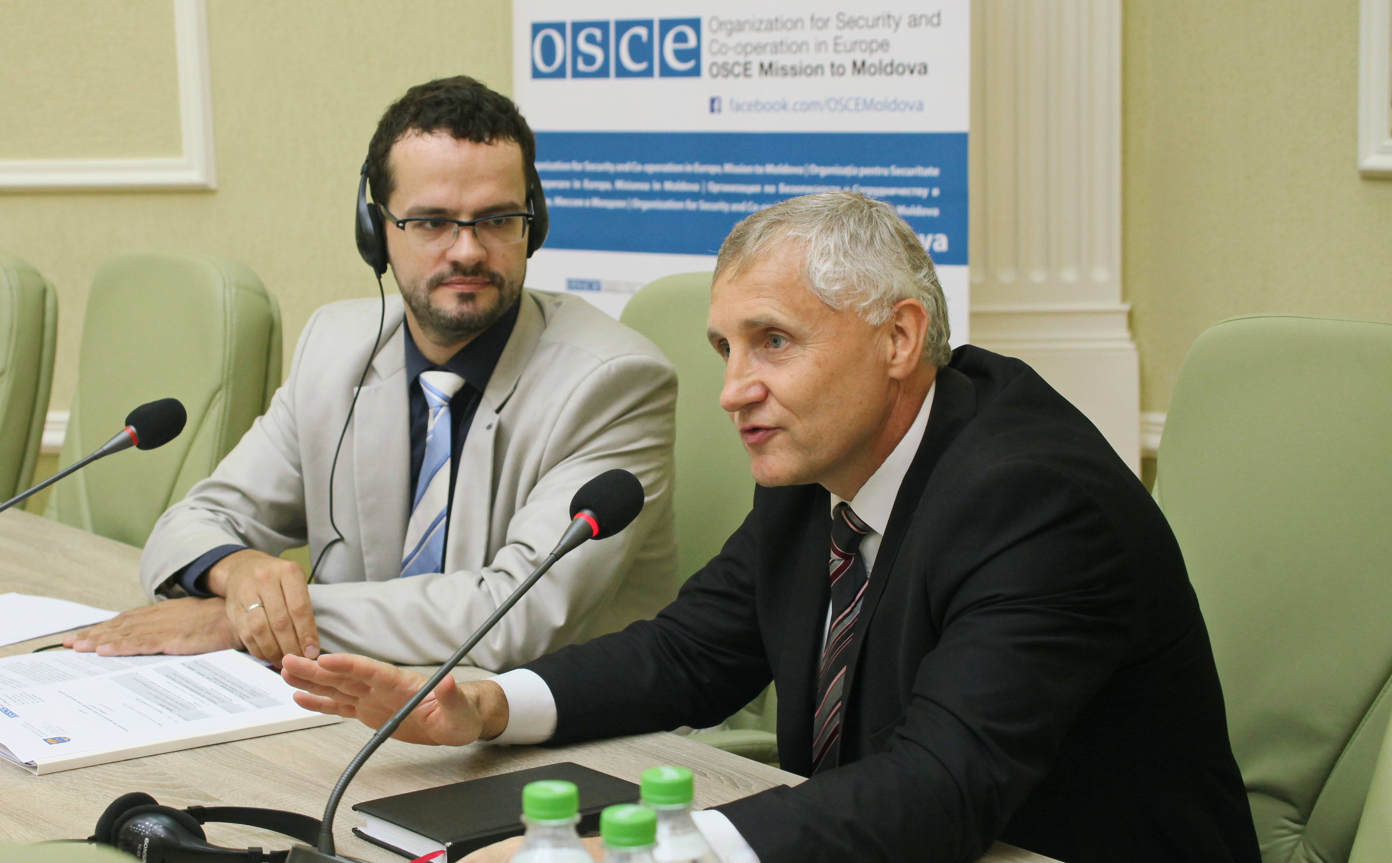 Viceministrul Justiției al Republicii Moldova, Nicolae Eșanu, ține cuvântul de deschidere în cadrul mesei rotunde, organizate de către OSCE, cu privire la modificările legislative în domeniul crimelor motivate de ură, Chișinău, 13 septembrie 2016.