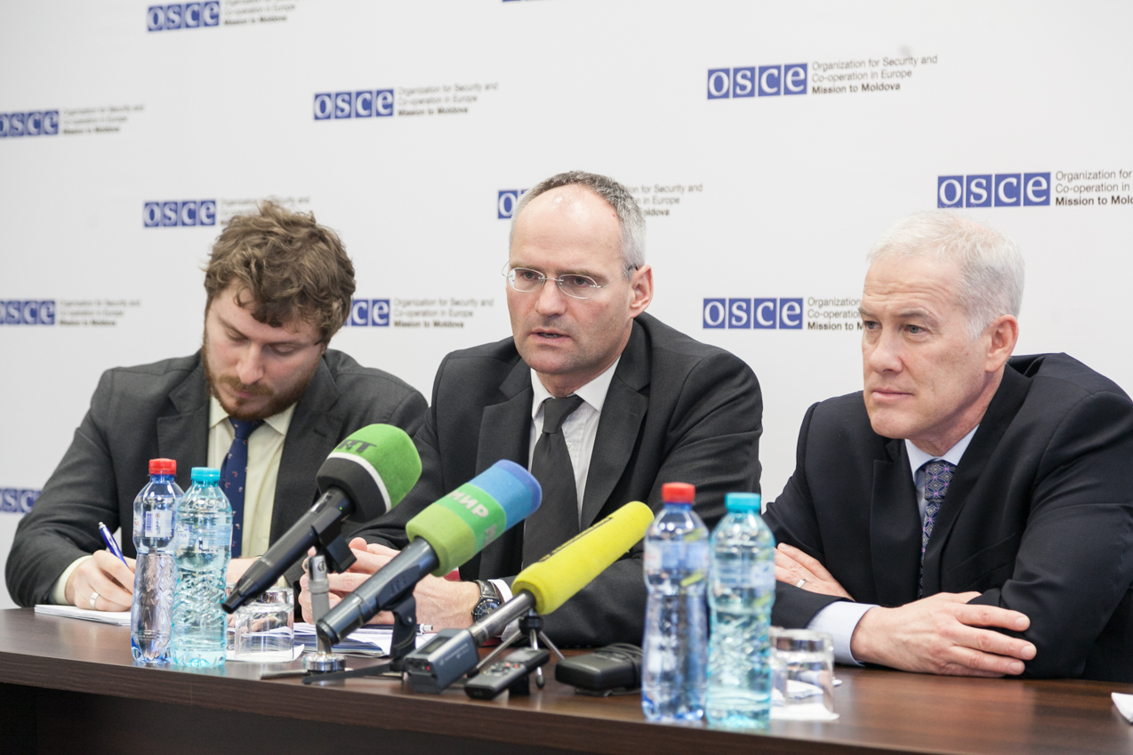 Ambasadorul Wolf-Dietrich Heim (c), Reprezentantul Special al Președintelui în exercițiu al OSCE pentru reglementarea transnistreană, și Ambasadorul Michael Scanlan (d), Șeful Misiunii OSCE în Moldova, vorbind la o conferință de presă la Chișinău, 24 martie 2017.