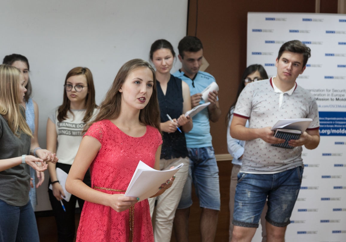 Participanții la un eveniment de instruire, organizat de Misiunea OSCE în Moldova, își practică deprinderile de dezbateri, Vadul-lui-Vodă, 16 iunie 2017.