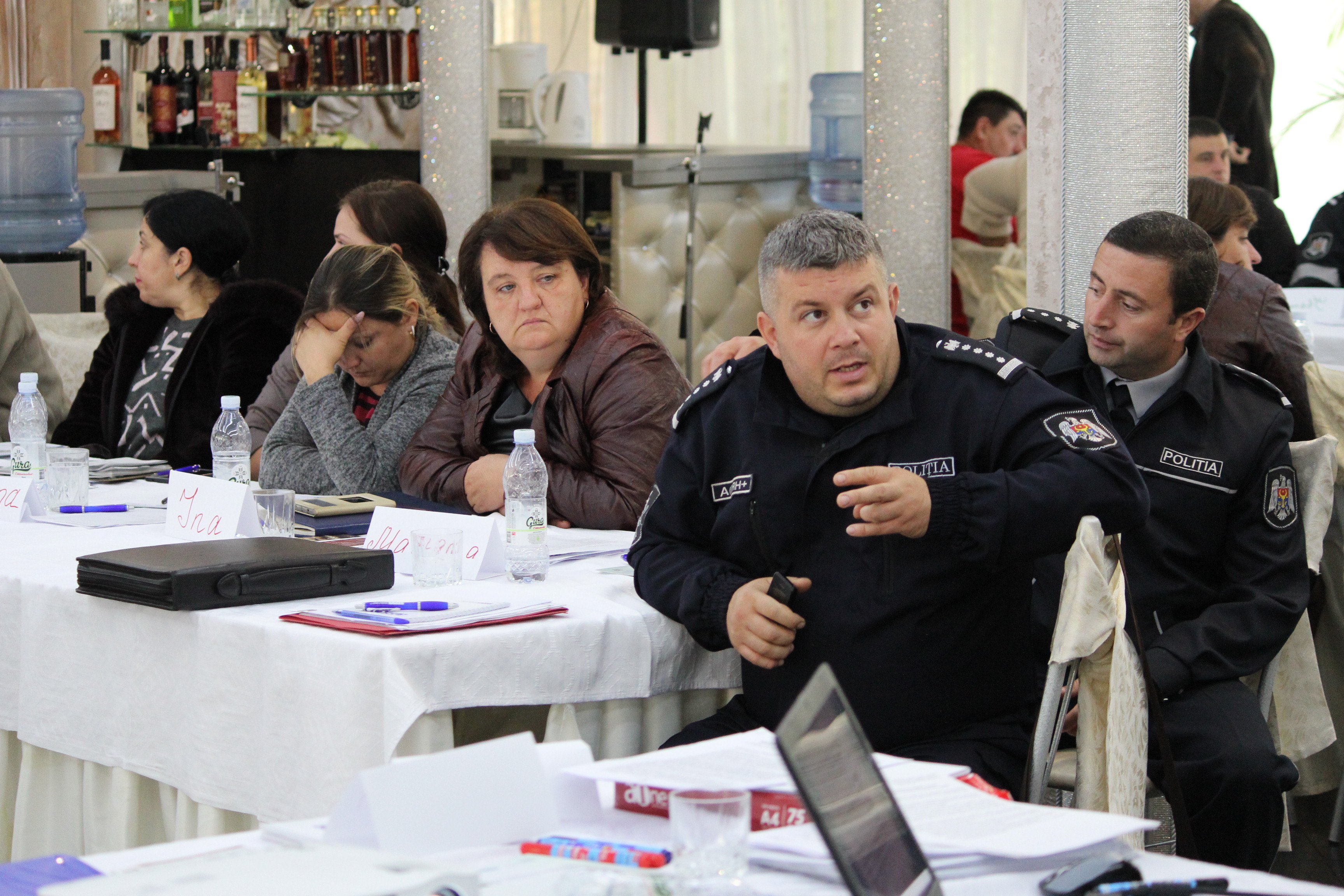 Ofițerul de poliție vorbește în cadrul sesiunii de instruire OSCE pentru organele de aplicare a legii privind combaterea violenței domestice, Florești, Moldova, 6 octombrie 2017.