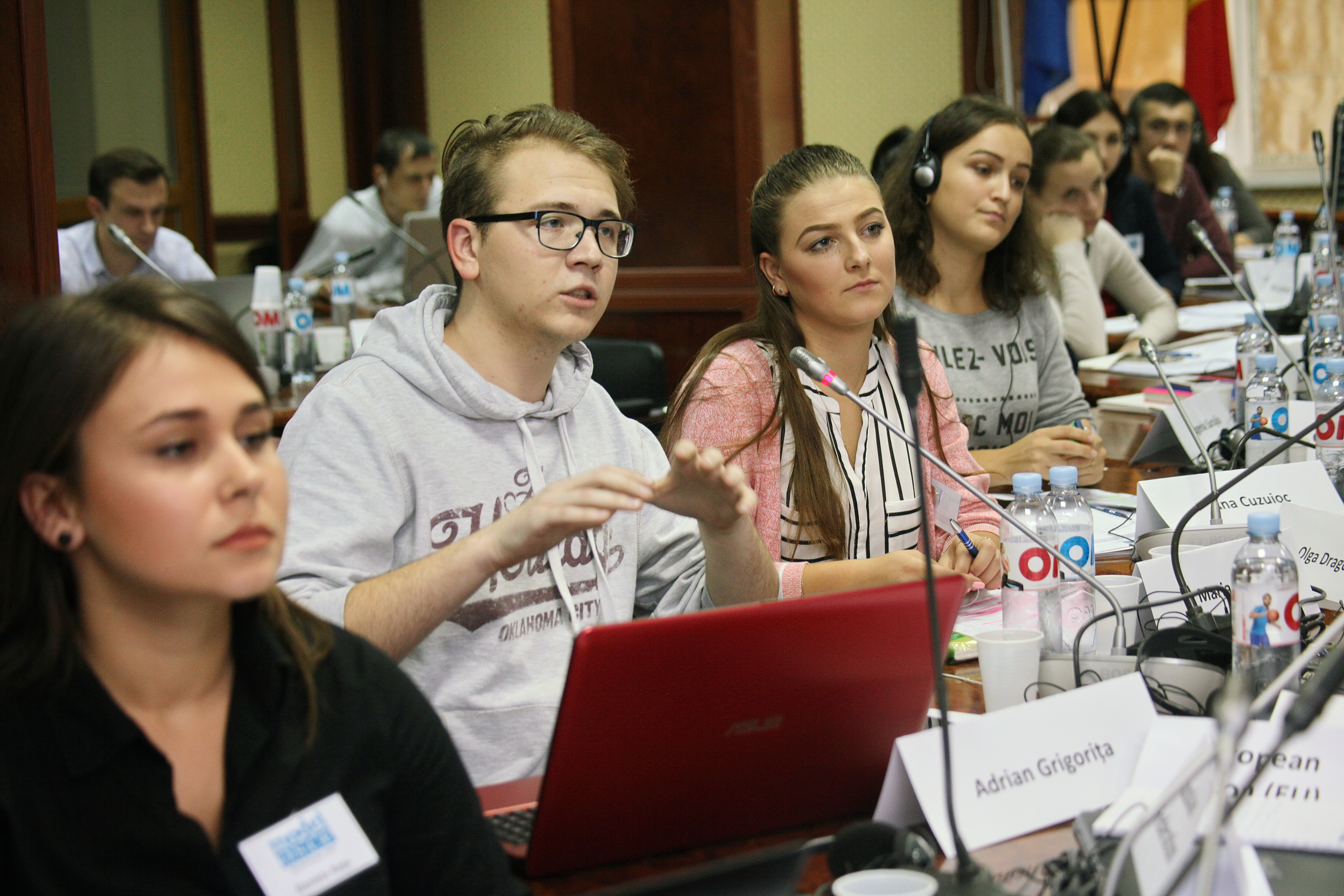 Participanții la cea de-a cincea ediție a Conferinței „Model OSCE” se implică într-un exercițiu de simulare a rezolvării unui conflict, Vadul lui Vodă, 26 octombrie 2017