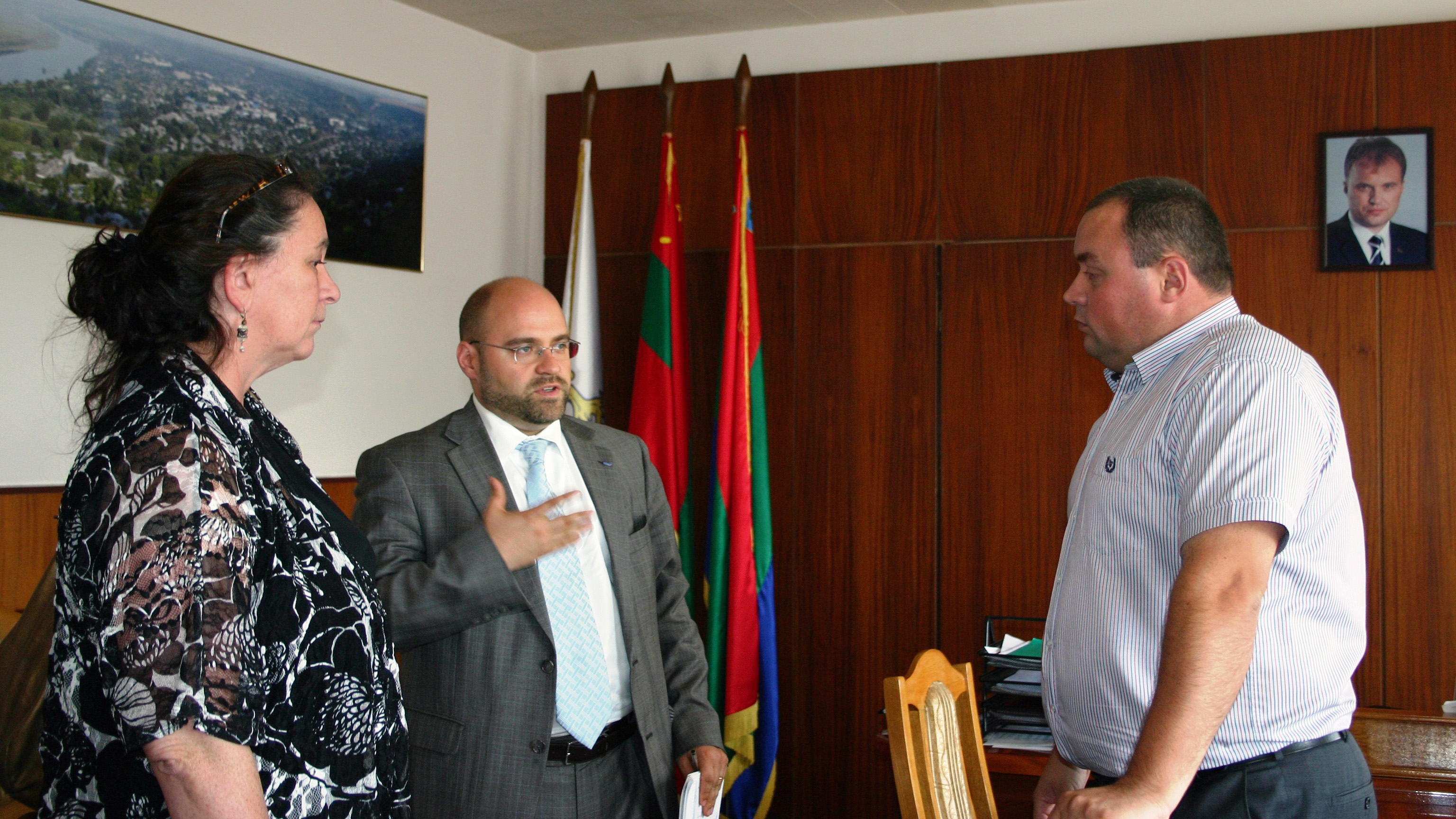 L-r: The Head of the OSCE Mission to Moldova Ambassador Jennifer Brush and political officer Lyndon Allin discuss the situation in the region after recent storms, with the head of the Camenca district Piotr Mustia, 23 July 2012.